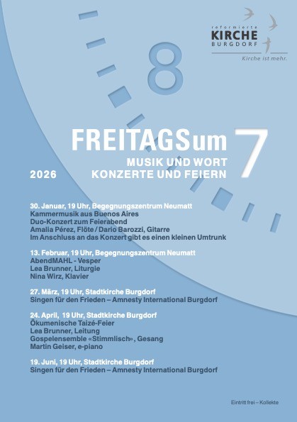 Dabei ist das Angebot «freitags um 7» entstanden und befindet sich nun im Aufbau. Es werden Musikanlässe und verschiedene gottesdienstliche Feiern zustande kommen. Diese werden freitags jeweils um 19 Uhr entweder in der Stadtkirche oder in der Neumattkirche stattfinden.