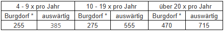 Einmalige Benützung, Tagestarif in CHF
