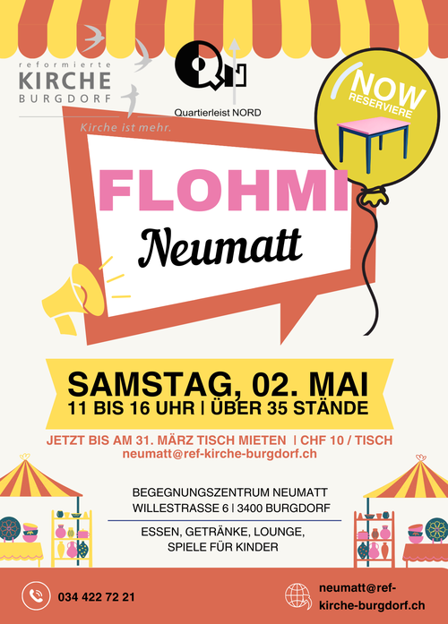 Am 2. Mai findet der grosse Flohmi in Zusammenarbeit mit dem Quartierleist NORD statt. Reserviere jetzt deinen Tisch (Pro Tisch CHF 10.00). Wir freuen uns von dir zu hören!