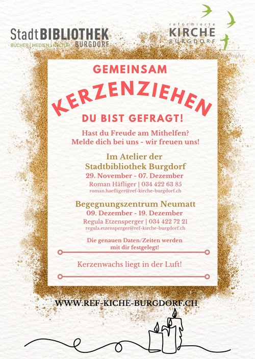 Ob du schon Erfahrung hast oder zum ersten Mal dabei sein möchtest – jede helfende Hand ist willkommen! Es gibt viele schöne Aufgaben: Wachs warmhalten, Gäste begrüssen, Kerzenziehen anleiten und Kerzen liebevoll dekorieren. Und ganz nebenbei wirst du Teil einer fröhlichen, engagierten Gemeinschaft, die dieses besondere Erlebnis überhaupt erst möglich macht.